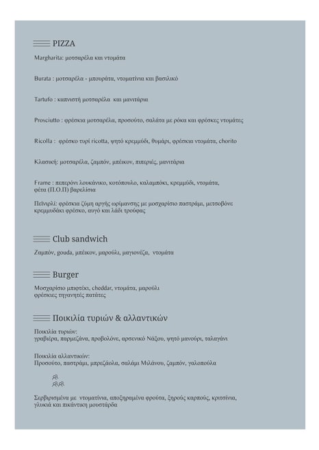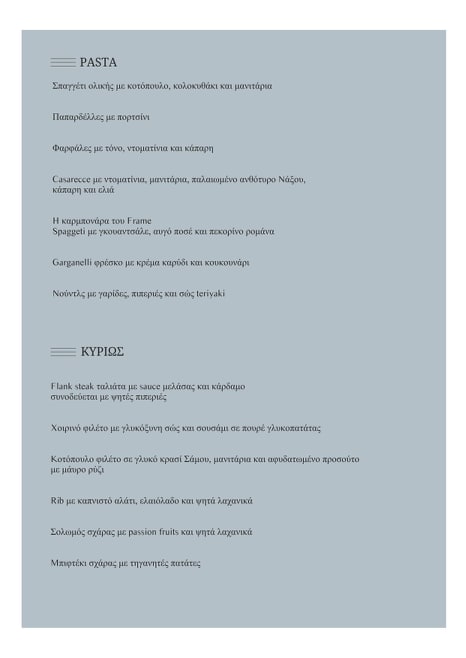 Το μενού σφραγίζει ο βραβευμένος σεφ Παναγιώτης Γουναρόπουλος και μας προτείνει μια ποικιλία από σαλάτες, burgers, πίτσες, ζυμαρικά και επιλογές σε κρεατικά και ψάρια. Σταθερή αξία. FRAME Bar Restaurant