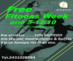 Ήρθε επιτέλους η στιγμή να επιστρέψεις, στις αγαπημένες σου συνήθειες και να επανέλθεις στην πιο FIT εκδοχή του εαυτού σου. Ξεκίνα με μια FREE FITNESS WEEK από 5/10 -12/10, και επωφελήσου από την επιπλέον ΕΚΠΤΩΣΗ 10% στα νέα μας πακέτα, 3μηνης και 6μηνης διάρκειας. Γνώρισε τις νέες μας υπηρεσίες που περιλαμβάνουν απεριόριστο GROUP PERSONAL σε ένα απόλυτα ασφαλές περιβάλλον, στις υπερσύγχρονες εγκαταστάσεις του Athletico Fitness Boutique. Κάνε κράτηση από τώρα στο 2431028284 για την δωρεάν εβδομάδα.