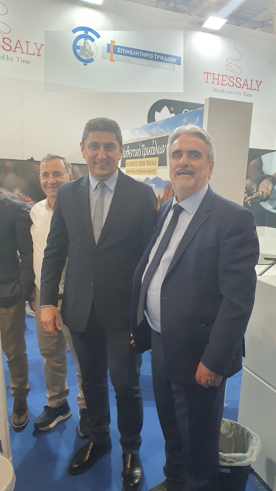 Στο περίπτερο του Επιμελητηρίου Τρικάλων, ο πρόεδρος Βασίλης Γιαγιάκος υποδέχτηκε τον Υπουργό Αγροτικής Ανάπτυξης και Τροφίμων κ. Λευτέρη Αυγενάκη, ο οποίος είχε την ευκαιρία να γευτεί τα μοναδικά τοπικά προϊόντα, κάνοντας ιδιαίτερη αναφορά στην ξεχωριστή γεύση του Λουκάνικου Τρικάλων με πράσο.