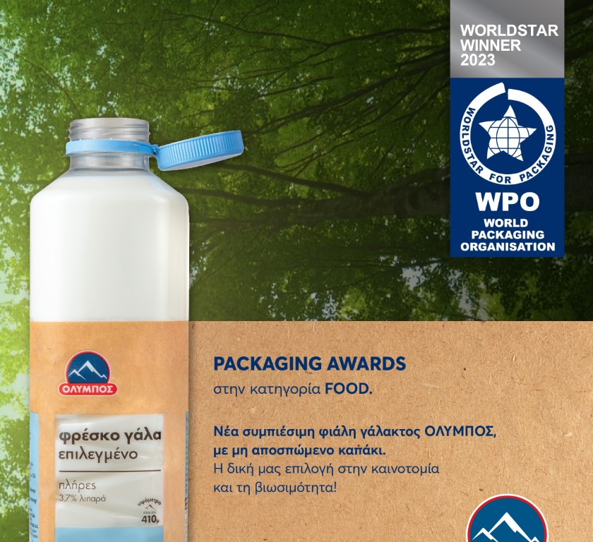 Μια ξεχωριστή αναγνώριση, μοναδική στο είδος της, συνιστά η βράβευση της ΟΛΥΜΠΟΣ στα World Packaging Awards 2023, για τη νέα συμπιέσιμη φιάλη με μη αποσπώμενο καπάκι, την οποία εισήγαγε πρώτη στην ελληνική αγορά του γάλακτος.