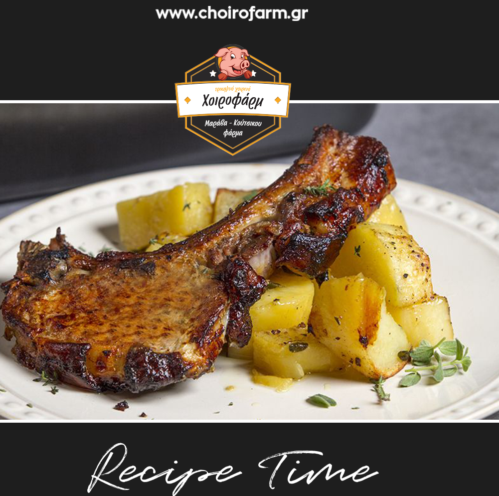 Σερβίρουμε τις μπριζόλες με τις πατάτες, λίγα μυρωδικά και μπόλικο ζουμάκι.