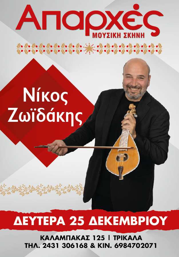 Την ημέρα τών Χριστουγέννων ο Νίκος Ζωιδάκης έρχεται στα Τρίκαλα. Μας ταξιδεύει με μαντινάδες και τραγούδια από τη δισκογραφία του ενώ θα μας κάνει και μια βόλτα με μουσικές από όλη την Ελλάδα αλλά και επιτυχίες μεγάλων Ελλήνων συνθετών.