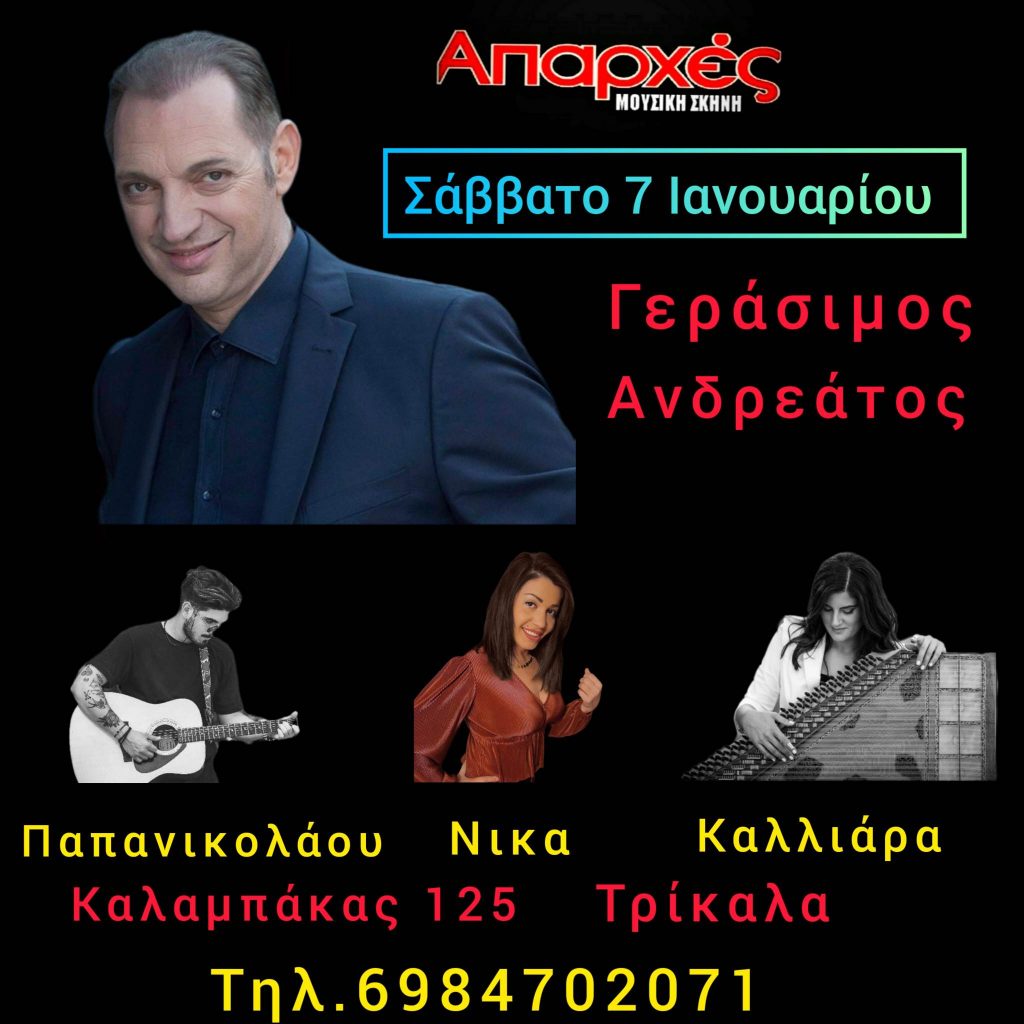 Λόγω κοινωνικής εκδήλωσης η μουσική σκηνή “ΑΠΑΡΧΕΣ” επιστρέφει το Σάββατο 7 Ιανουαρίου με όλο το επιτελείο της. Με τον Γεράσιμο Ανδρεάτο την Δήμητρα Καλλιάρα , Μαρία Νίκα και τον Πάνο Παπανικολάου., οι οποίοι κράτησαν ζωντανή τη διασκέδαση στην πόλη μας τις μέρες των Γιορτών.