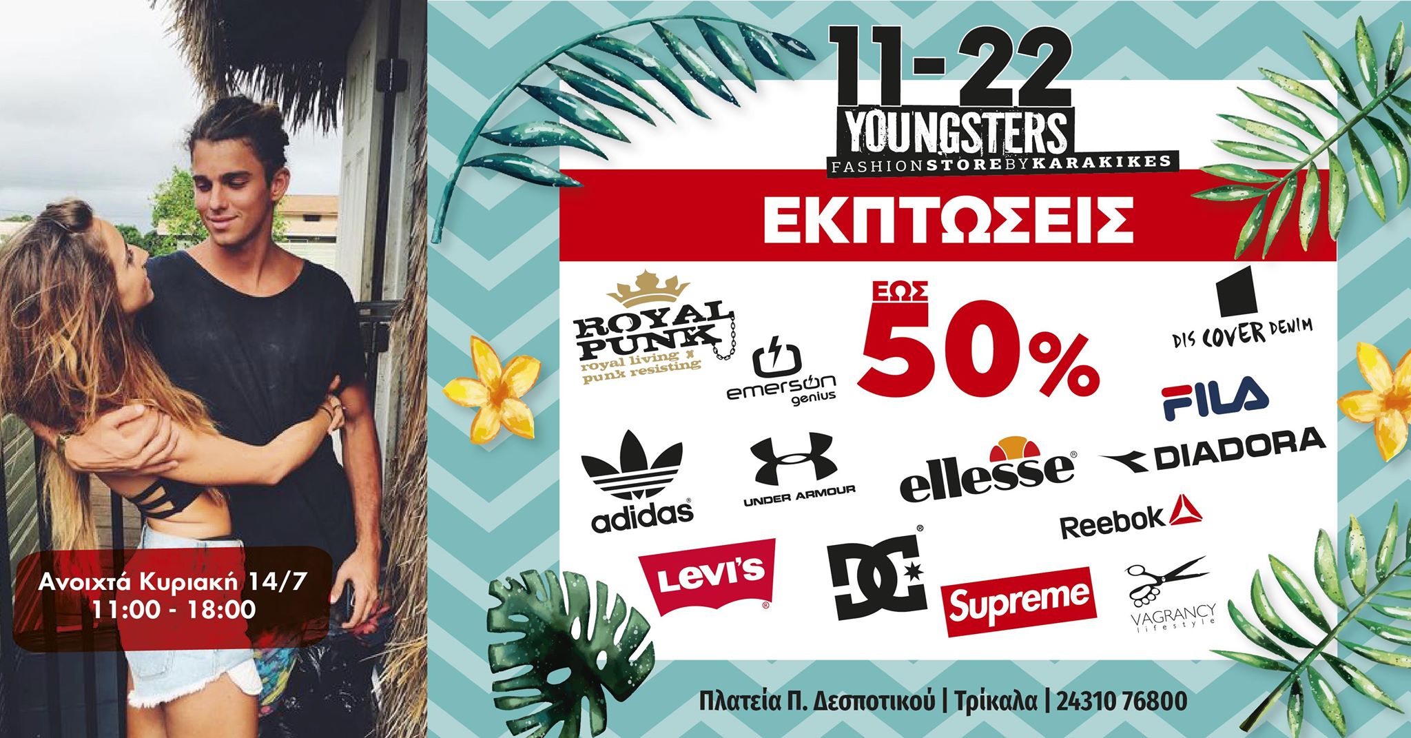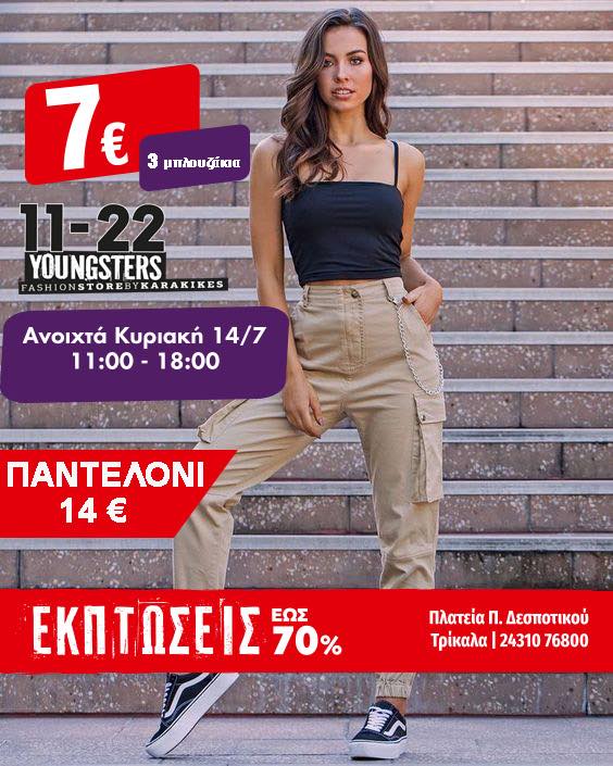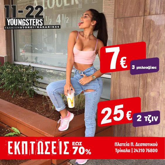 Στα Τρίκαλα οι εκπτώσεις… έχουν όνομα και σφραγίδα 11-22 Youngsters ΚΑΡΑΚΙΚΕΣ. Ανανεώστε την γκαρνταρόμπα σας με μοναδικές τιμές και προσφορές στο κατάστημα της πλατείας Δεσποτικού που καθορίζει τη μόδα.