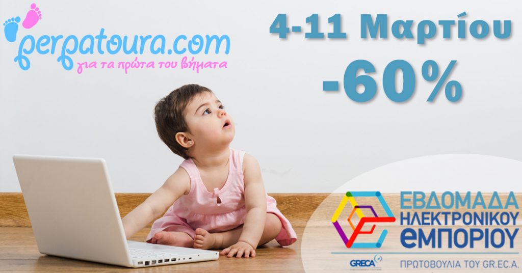 Το βρεφικό e-shop perpatoura.com συμμετέχει στην εβδομάδα Ηλεκτρονικού Εμπορίου σε συνεργασία με τον GR.E.C.A, τον επίσημο σύνδεσμο ηλεκτρονικού εμπορίου Ελλάδος. Έτσι, από 4 έως τις 11Μαρτίου 2019, οι επισκέπτες του www.perpatoura.com απολαμβάνουν απίθανες προσφορές με δωρεάν αποστολή σε όλη την Ελλάδα, με αξιακό καλάθι 59€ και άνω.