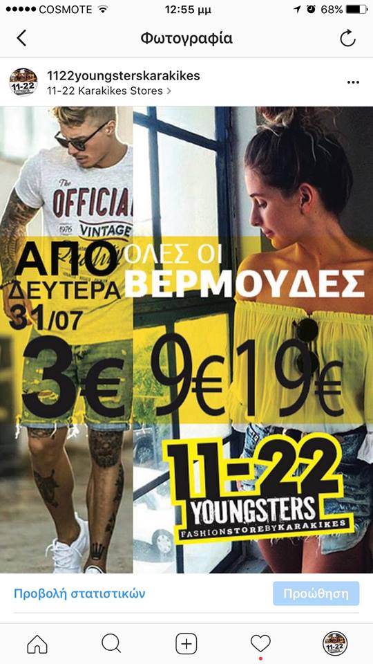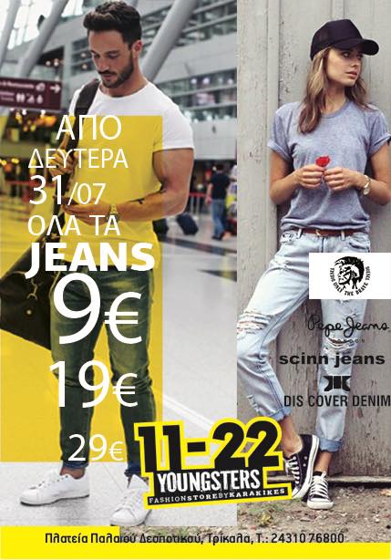 Σε μια ακόμη μοναδική προσφορά προς τους πελάτες του προχωρά το 11-22 YOUNGSTERS  ΚΑΡΑΚΙΚΕΣ στην πλατεία Δεσποτικού. Από αυτή τη Δευτέρα 31 Ιουλίου και μέχρι εξαντλήσεως των αποθεμάτων όλα τα jeans  μόνο… 9 €-19 € και 29 €!!!