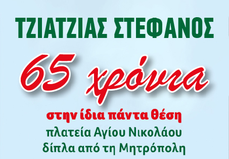 Το κατάστημα Τζιατζιάς Στέφανος γιορτάζει 65 χρόνια λειτουργίας στον χώρο των αλεύρων, οσπρίων και ζωοτροφών στην ίδια πάντα θέση πλατεία Αγίου Νικολάου δίπλα από τη Μητρόπολη.