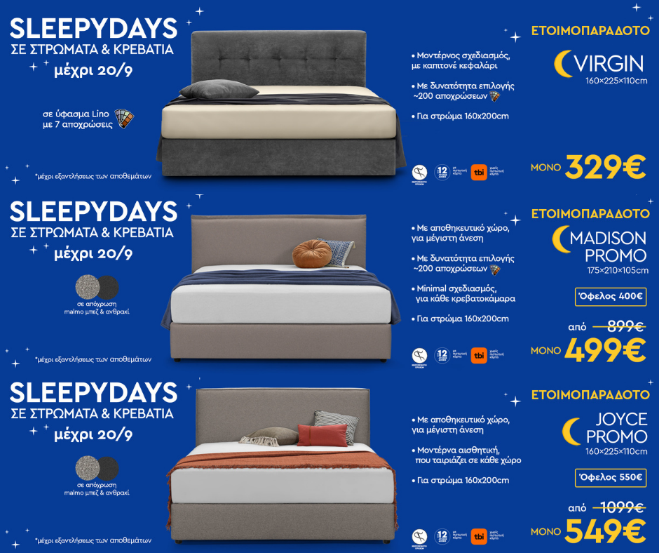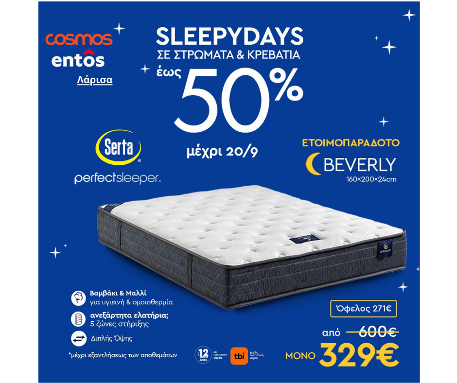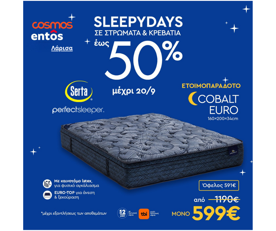Απόκτησε το στρώμα ή το κρεβάτι των ονείρων σου σε Sleepy Days τιμές έως -50% μέχρι τις 20 Σεπτεμβρίου. Έλα στο κατάστημα Cosmos στη Λάρισα και διάλεξε το δικό σου σύστημα ύπνου.