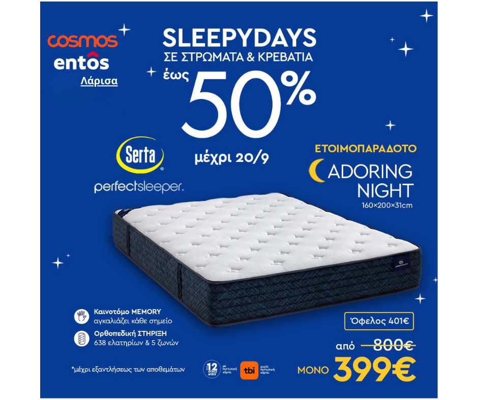Ο Σεπτέμβριος φέρνει τις Sleepy Days στο κατάστημα Cosmos στη Λάρισα, με μοναδικές προσφορές έως -50% σε στρώματα και κρεβάτια Entos. Αναβάθμισε την ποιότητα του ύπνου σου με τα κορυφαία ανατομικά στρώματα SERTA, KING KOIL και ROYAL CROWN σε τιμές Sleepy Days και απόλαυσε στήριξη, υψηλή ποιότητα και ξεχωριστό design κάθε βράδυ. Τα statement κρεβάτια της συλλογής προσφέρουν εκατοντάδες επιλογές υφασμάτων, σχεδίων και στυλ, ενώ τα κρεβάτια με αποθηκευτικό χώρο αποτελούν την πιο έξυπνη λύση για μικρά ή μεγάλα υπνοδωμάτια. Στη συλλογή θα βρεις επίσης μαξιλάρια και όλα τα απαραίτητα για να δημιουργήσεις το δικό σου sleep universe.