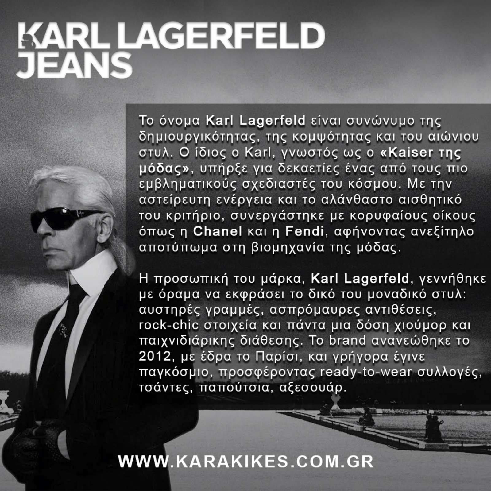 Γίνεται γνωστή η συνεργασία της Τρικαλινής επιχείρησης με την εταιρία KARL LAGERFELD JEANS του σχεδιαστή KARL ΣΕ ΓΥΝΑΙΚΕΙΑ ΑΝΤΡΙΚΑ ΡΟΥΧΑ ΥΠΟΔΗΜΑΤΑ ΤΣΑΝΤΕΣ & ΑΞΕΣΟΥΑΡ στο ηλεκτρονικό μας κατάστημα www.karakikes.com.gr