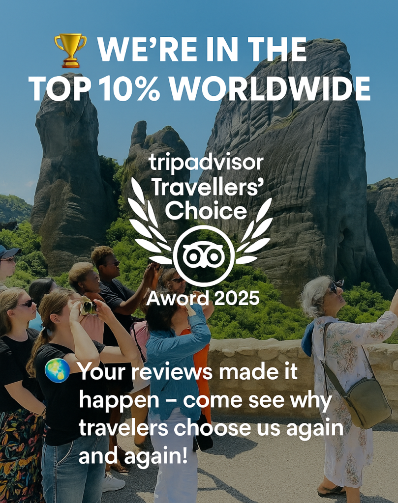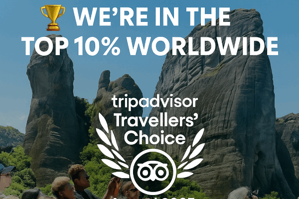 Η Meteora Thrones – Travel Center ανακοινώνει με μεγάλη χαρά και υπερηφάνεια ότι κέρδισε για 5η συνεχή χρονιά το βραβείο TripAdvisor Travellers‘ Choice Award 2025, κατατασσόμενη στο 10% των καλύτερων εταιριών τουρισμού παγκοσμίως.