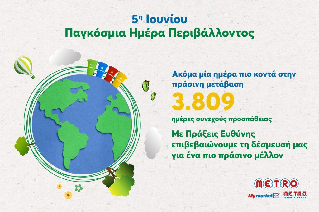 Από το 2015, η METRO (My market και METRO Cash & Carry ) έχει σχεδιάσει και υλοποιεί με συνέπεια και επιτυχία ένα φιλόδοξο και στοχευμένο στρατηγικό σχέδιο βιωσιμότητας, με στόχο την ουσιαστική μείωση του ανθρακικού της αποτυπώματος και την επίτευξη ενεργειακής ουδετερότητας στις εγκαταστάσεις της έως το 2027. Για την εταιρεία, η 5η Ιουνίου, η Παγκόσμια Ημέρα Περιβάλλοντος, δεν αποτελεί απλώς μία αφορμή για γιορτή, αλλά η επιβεβαίωση μίας διαδρομής που μετρά ήδη 3.809 ημέρες συνεχούς δράσης.