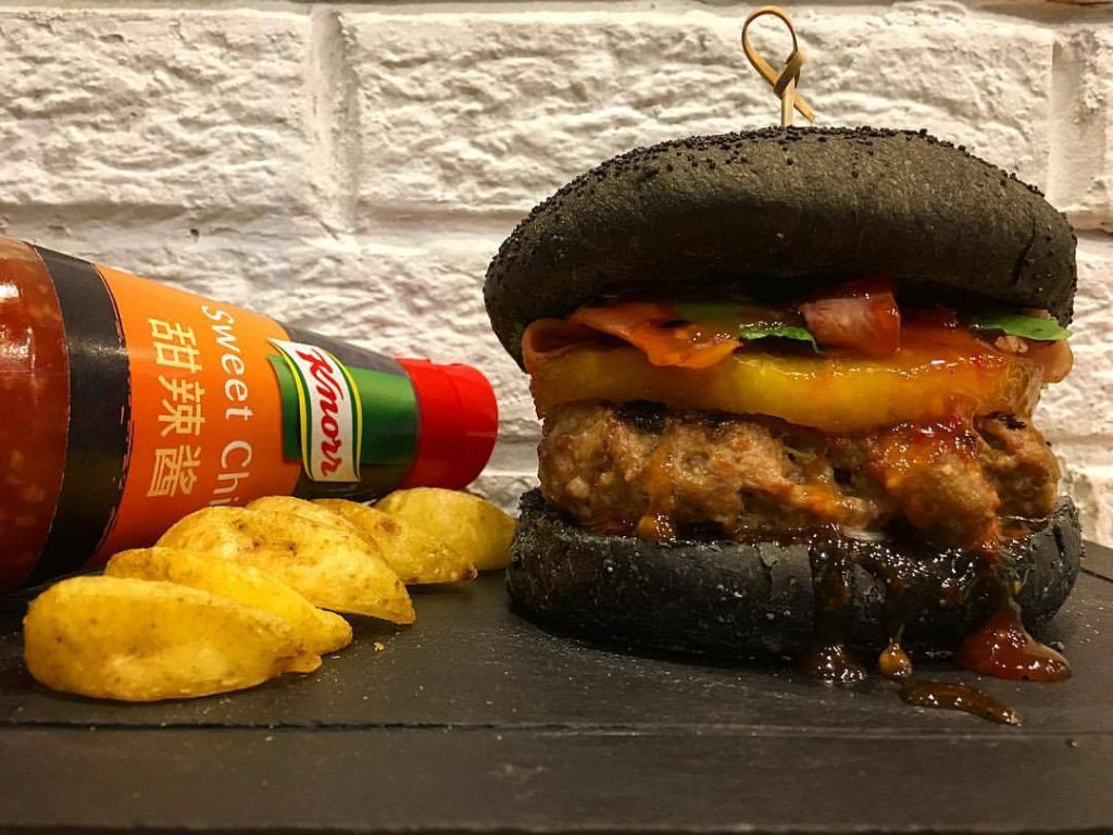 Απολαύστε burger με ψωμί από ενεργό άνθρακα, χειροποίητο μοσχαρίσιο κιμά, καραμελωμένο ανανά, τραγανό μπέικον, φρέσκα φύλλα ρόκας και αυθεντική πικάντικη Σάλτσα με Τσίλι της knorr!