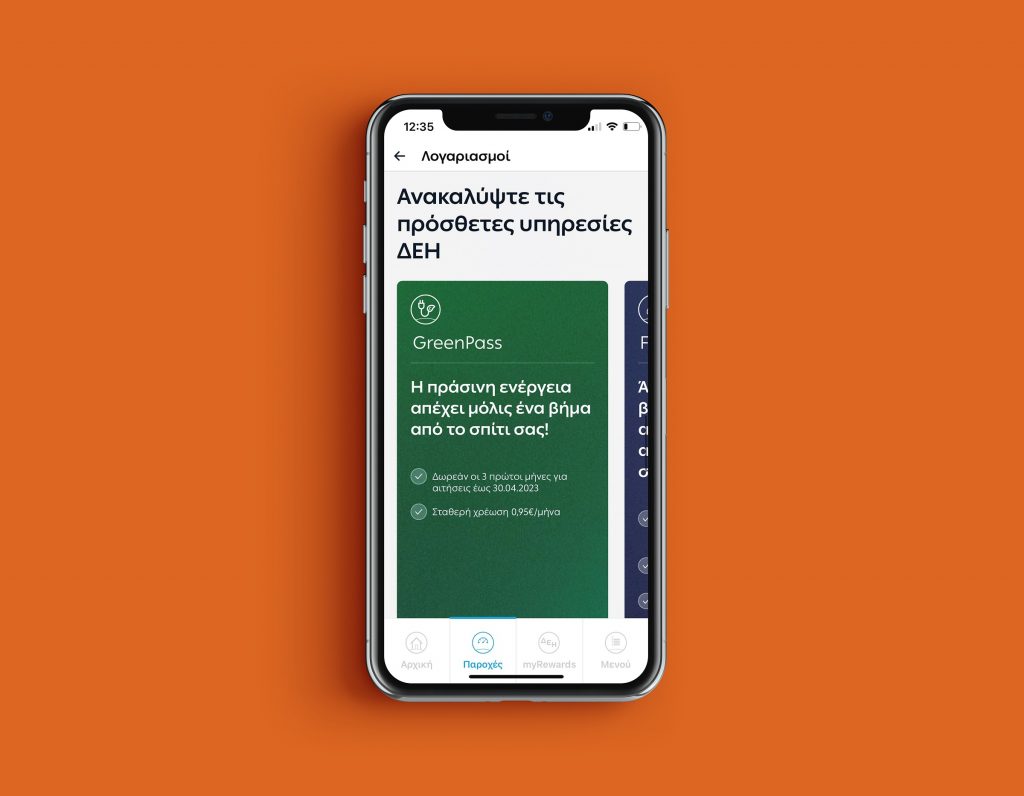 Για παράδειγμα, στο myΔΕΗ μπορεί να ενεργοποιηθεί ηλεκτρονικά το ΔΕΗ myHome 4All, το νέο οικιακό κυμαινόμενο πρόγραμμα της ΔΕΗ, που περιέχει δωρεάν την υπηρεσία GreenPass δίνοντας την δυνατότητα σε νέους και υφιστάμενους πελάτες να μειώσουν το ενεργειακό τους αποτύπωμα, ενώ τους ανταμείβει όταν εξοικονομούν ενέργεια.