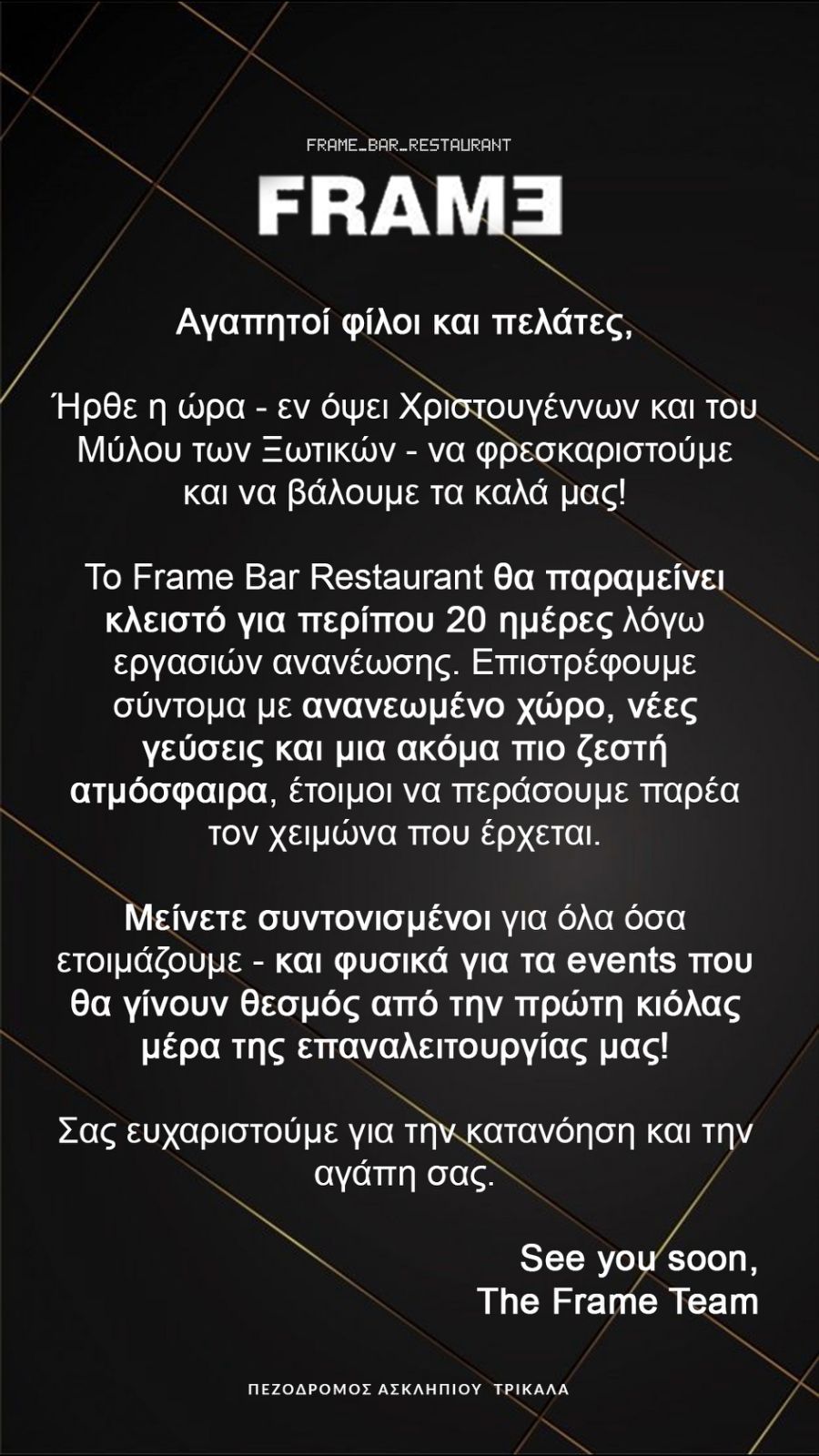 Το FRAME είναι το κορυφαίο Bar-restaurant στην πόλη και ήταν αυτό που έφερε τη μεγάλη αλλαγή πριν 15 χρόνια. Ένας κύκλος έκλεισε και ένας νέος ανοίγει καθώς φρεσκαρίζεται προκειμένου να αλλάξει και πάλι τα δεδομένα στα Τρίκαλα.