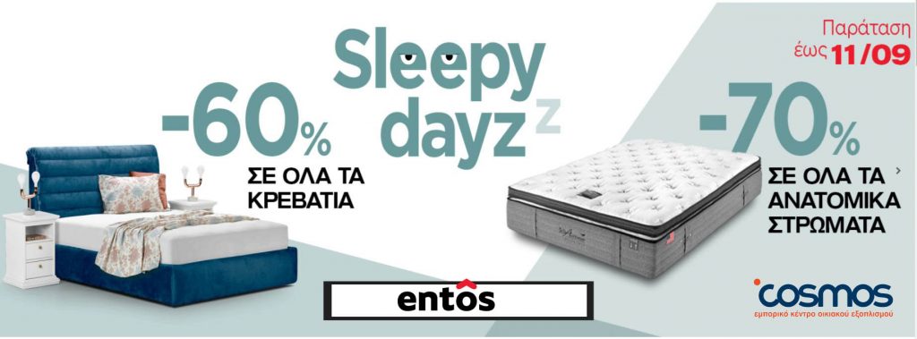 Μέχρι τις 11 Σεπτεμβρίου, η entos προσφέρει -60% σε όλα τα κρεβάτια και -70% σε όλα τα ανατομικά στρώματα.