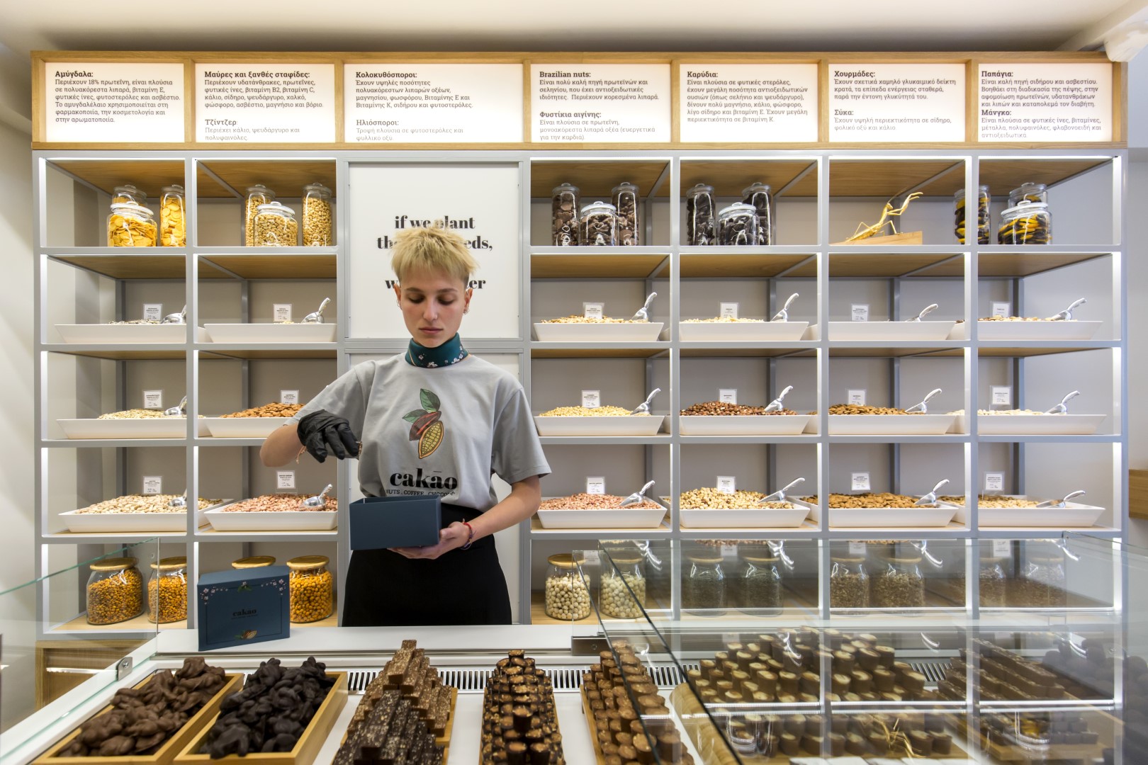 Οι εκπλήξεις δεν σταματούν εδώ. Ακριβώς δίπλα από το The new green μας υποδέχεται το Cakao, ένα καινοτόμο κατάστημα που μας συναρπάζει με το καλημέρα με τη μυρωδιά των φρεσκοψημένων ξηρών καρπών (στο φούρνο του καταστήματος) και ξυπνάει την πόλη με το δυνατό άρωμα του καφέ. Στο Cakao βρίσκουμε μια τεράστια ποικιλία σε σοκολάτες και σοκολατοειδή, χειροποίητες μπάρες δημητριακών, πραλίνες, τρούφες, ξηρούς καρπούς, αποξηραμένα φρούτα κ.α..