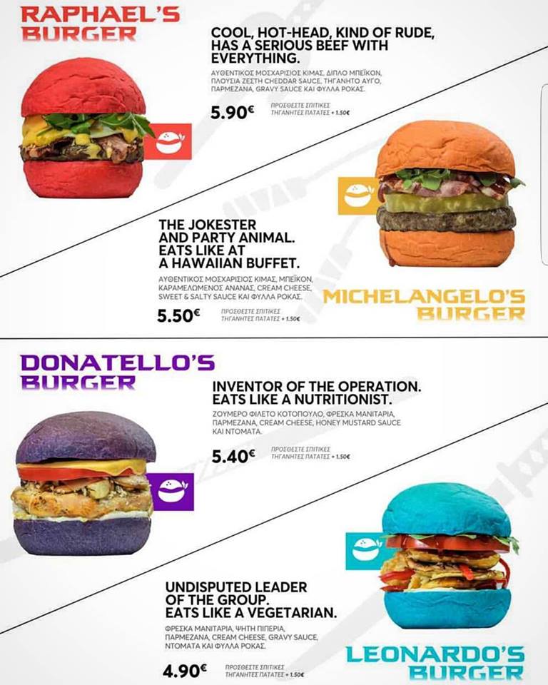Τέσσερις μοναδικές συνταγές, το Raphael’s Burger (μπιφτέκι, διπλό μπέικον, πλούσια ζεστή cheddar sauce, τηγανητό αυτό, παρμεζάνα, gravy sauce και φύλλα ρόκας), το Michelangelo’s Burger (μπιφτέκι, μπέικον, καραμελωμένος ανανάς, cream cheese, sweet & salty sauce και φύλλα ρόκας), το Donatellos’ Burger (ζουμερό φιλέτο κοτόπουλο, φρέσκα μανιτάρια, παρμεζάνα, cream cheese, honey mustard sauce και ντομάτα) και το Leonardo’s Burger (φρέσκα μανιτάρια, ψητή πιπεριά, παρμεζάνα, cream cheese, gravy sauce, ντομάτα και φύλλα ρόκας).
