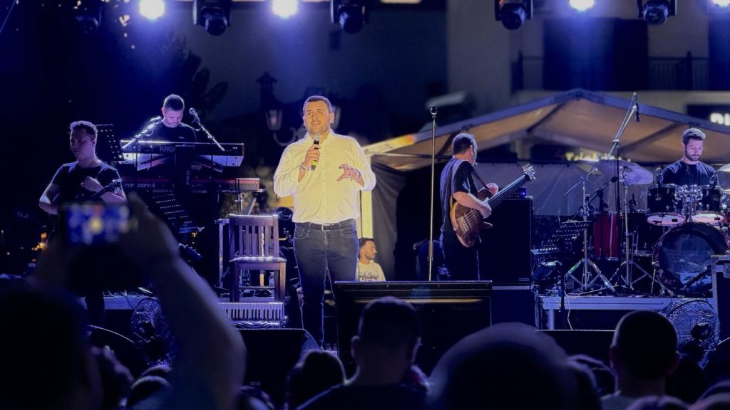Ο νεαρός δήμαρχος– τον οποίο στους 7 μήνες θητείας του τον έχουμε δει να φτιάχνει φασολάδες, να ψήνει σουβλάκια, να κουβαλάει τραπέζια και καρέκλες, να βουτάει στα λασπόνερα και άλλα πολλά- είναι γνωστό ότι έχει μια λατρεία στο μικρόφωνο και στη σκηνή, και διακρίνεται στη φωτό παραπάνω ενώ προλογίζει τον Στέλιο Ρόκκο στη μεγάλη συναυλία που έδωσε αυτός στη σκιά των Μετεώρων…