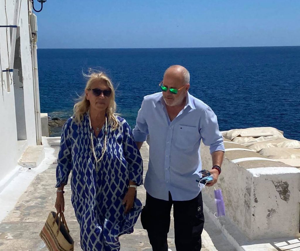 Τα χαρτιά του ακόμη δεν τα έχει ανοίξει και περιορίζεται σε περιπλανήσεις ανά το Αιγαίο με εκλεκτούς φίλους του. Καλή ώρα διακρίνεται στη φωτό παραπάνω με την κουμπάρα του Λία Δανιόλου-Πολέμη λίγα μέτρα από το εμβληματικό ξενοδοχείο «Μικρά Αγγλία» της Άνδρου…