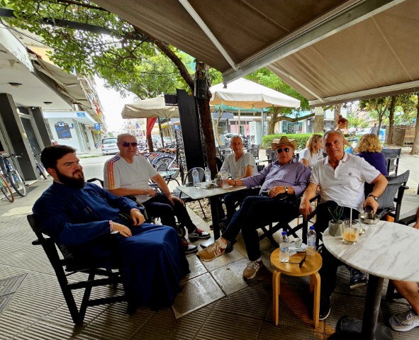 Στη φωτογραφία παραπάνω διακρίνονται δυο… άγιοι, ο Πρωτοσύγκελλος Αλέξιος και ο της χωροφυλακής Γιάννης Γατσάς. Μαζί τους οι δίκαιοι Κώστας Ψύχος, άλλοτε Τσάρος της τοπικής Οικονομίας, Ντίνος Κοτρώνης με… καουμπόικο καπέλο και Ηλίας Βλαχογιάννης, άκρως καλοκαιρινός…