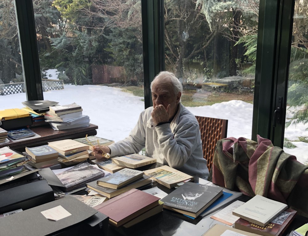 Δεν πτοήθηκε… Με πλεκτά πουλόβερ και γάντια παρέμεινε στο «κιόσκι» του, εκεί όπου διαβάζει και συγγράφει μανιωδώς και συνέχισε το έργο του και με θερμοκρασίες κοντά στους 0 C!!!…