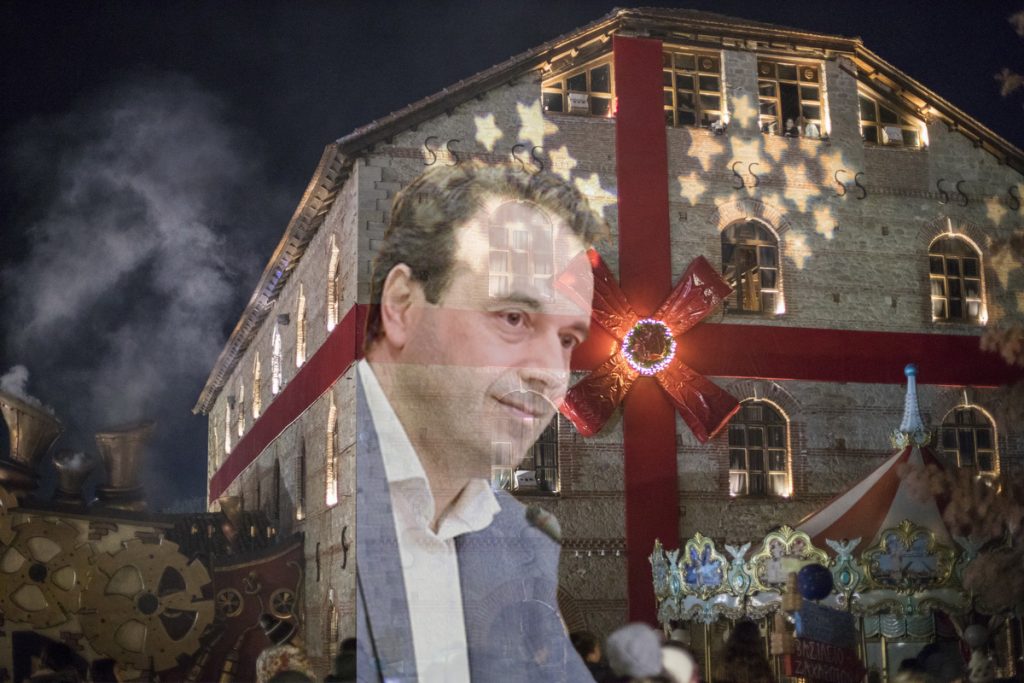 Εμείς στολίσαμε για εσάς το «Μύλο των Ξωτικών» με την προσωπογραφία του ηγέτου ημών, του δημάρχου μας Δημήτρη Παπαστεργίου (… όπως φωτίστηκε η Βουλή με την εικόνα της Παναγίας προ μηνός ένα πράμα)…