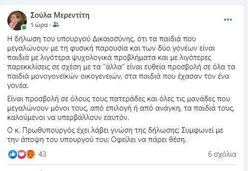 Η πρώην βουλευτίνα Σούλα Μερεντίτη, η οποία και μεγάλωσε μόνη τα τρία παιδιά της μετά το θάνατο του συζύγου της Θωμά υπήρξε ιδιαίτερα αυστηρή (… επιεικώς) σε ανάρτησή της: