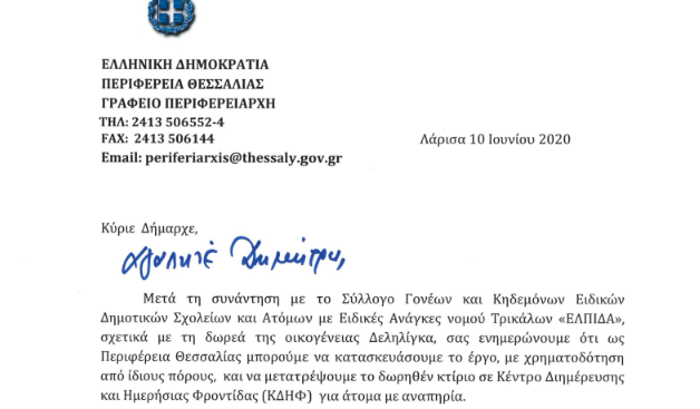 Όπως αποκαλύπτει δε το trikalavoice.gr η τελευταία του επιστολή, μόλις την περασμένη Πέμπτη, προς τον δήμαρχο Τρικκαίων είναι σε προσωπικό τόνο, ξεκινάει με το χειρόγραφο «αγαπητέ Δημήτρη» και σε αυτή αναφέρεται στην ανάγκη συνεργασίας για το κέντρο ΑμΕΑ του Συλλόγου «Ελπίδα» στη δωρεά Δεληλίγκα. Αναλυτικά η επιστολή παρακάτω: