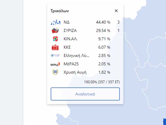 Για την ιστορία παρατίθενται τα ποσοστά που πήραν στα Τρίκαλα τα κόμματα στις τελευταίες εθνικές εκλογές, του Ιουλίου του 2019: