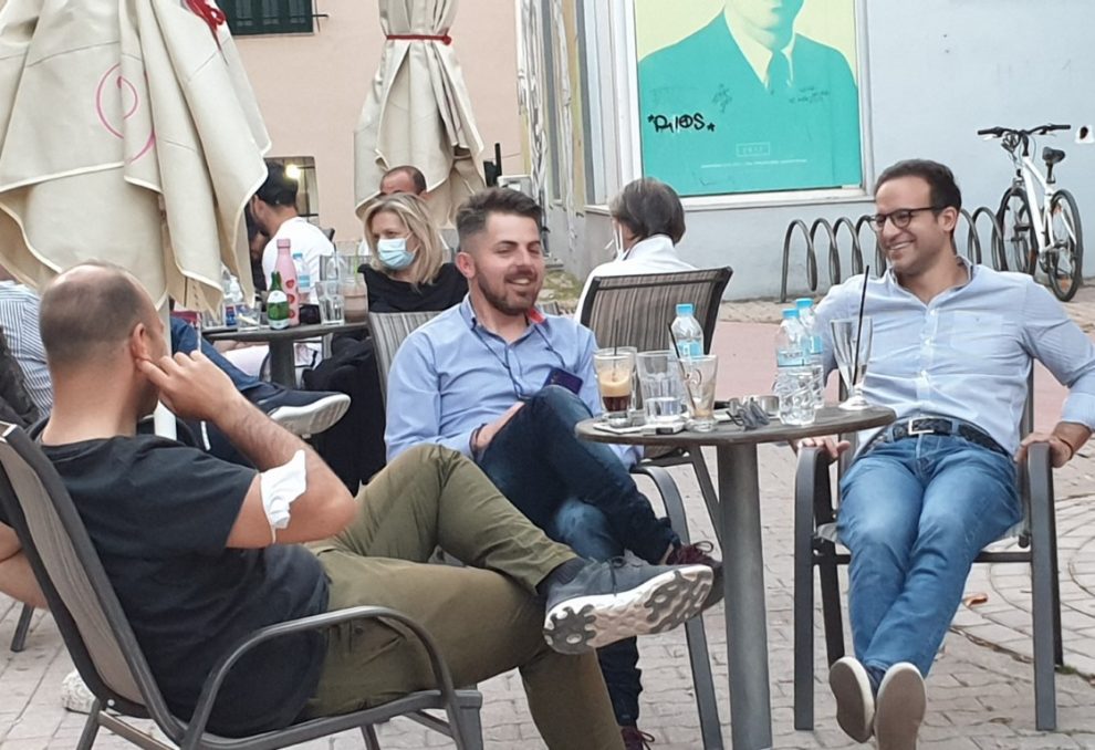 Διακρίνεται σε στιγμές χαλάρωσης ένα από αυτά τα απογεύματα με τον πρόεδρο της τοπικής Πύλης της Ν.Δ. Αλέκο Αραπογιάννη και τον στενό του συνεργάτη Βασίλη Χρισταντώνη.