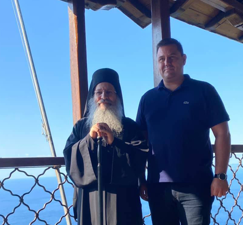 Ο νεαρός αντιδήμαρχος Τρικκαίων πραγματοποίησε προσκύνημα μεγάλο στο περιβόλι της Παναγιάς και επισκέφτηκε σε πνεύμα κατάνυξης και με φόβο Θεού πολλές Μονές, ακόμη και τις περισσότερες Σκήτες αυτού. Αγρύπνησε με τους μοναχούς, ερεύνησε, μέτρησε και τήρησε την τάξη. Άνοιξε την καρδία του και μίλησε με σπουδαίους καλογέρους, περίφημους γεροντάδες του Αγίου Όρους. Διακρίνεται χαρακτηριστικά παραπάνω με τον εκ του Μυροφύλλου Τρικάλων-κατά σάρκα αδελφό του επί δεκαετίες προέδρου της ακριτικής κοινότητας Γεωργίου Ράπτη-γέροντα Ελισσαίο, Ηγούμενο της Ιεράς Μονής Σίμωνος Πέτρας στο πολυφωτογραφημένο μπαλκόνι της Μονής με φόντο το απέραντο γαλάζιο.