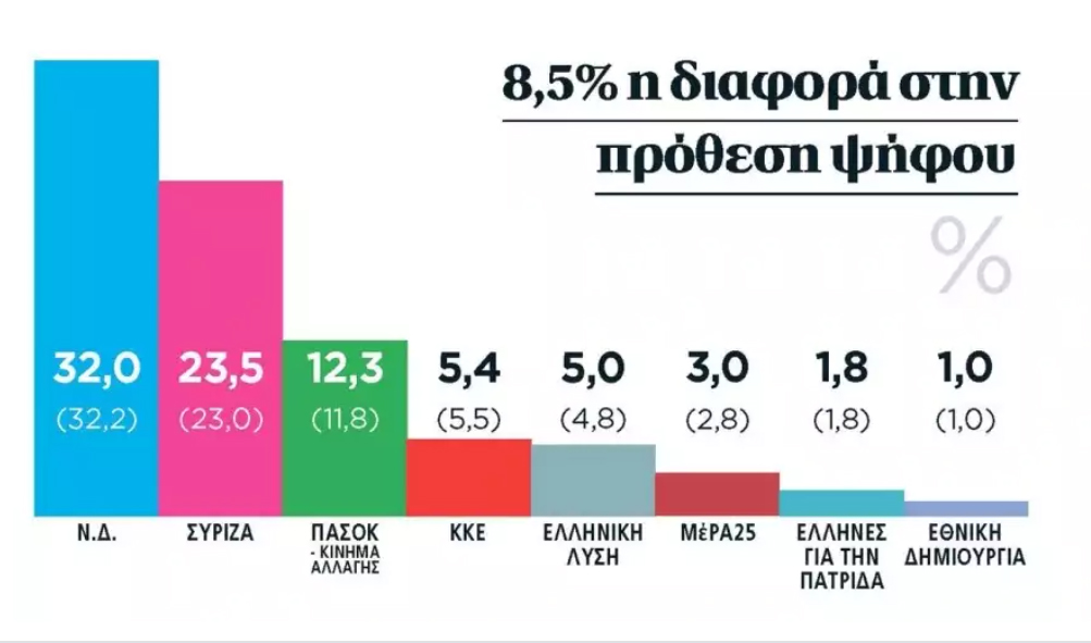 Αναλυτικά στην πρόθεση ψήφου τα κόμματα λαμβάνουν τα εξής ποσοστά: