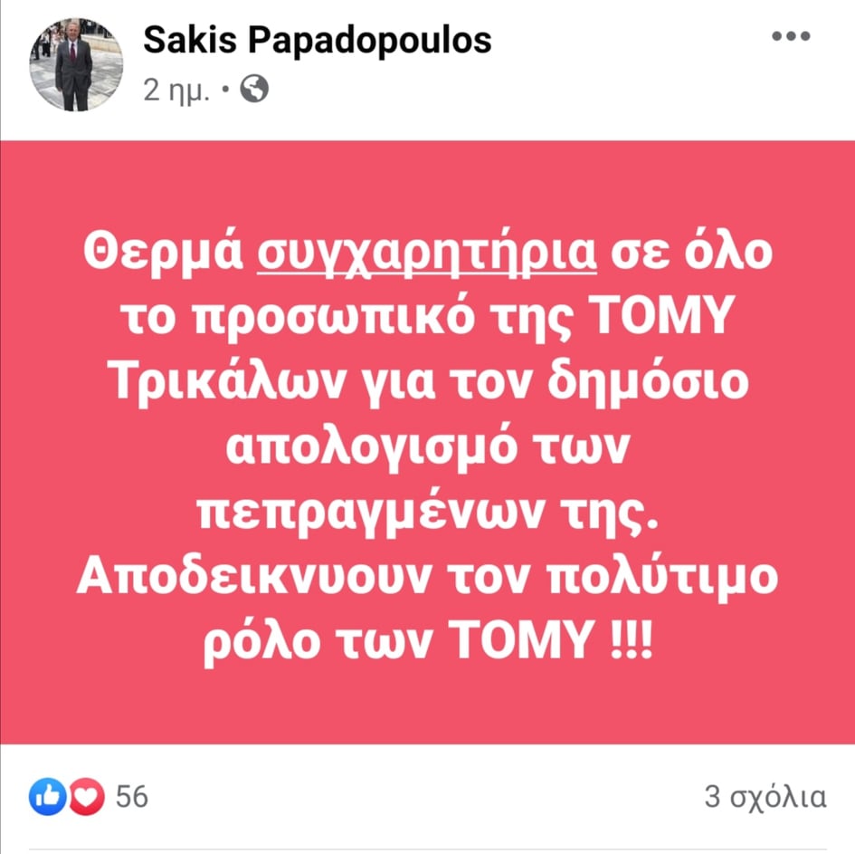 Ομιλούμε για τη Δήμητρα Νάτσινα η οποία εδώ και μια 3ετία πραγματικά κάνει εξαιρετική δουλειά στην ΤΟΜΥ Τρικάλων εξυπηρετώντας τους πολίτες. Συντονίζει το προσωπικό, το οποίο στέκεται πραγματικά στο ύψος των περιστάσεων και αναδεικνύει την ΤΟΜΥ σε “καταφύγιο” κάθε πονεμένου. Η ανάρτηση του Σάκη Παπαδόπουλου χαρακτηριστική: