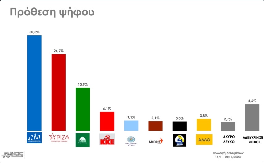 Εντωμεταξύ δημοσκόπηση που δημοσιεύτηκε χθες, της εταιρείας RASS καταγράφει δυναμική άνοδο του ΠΑΣΟΚ στο 13.9%, το οποίο με αναγωγή φτάνει στο 15.63% και εξελίσσεται σε καθοριστικό παράγοντα των εξελίξεων.