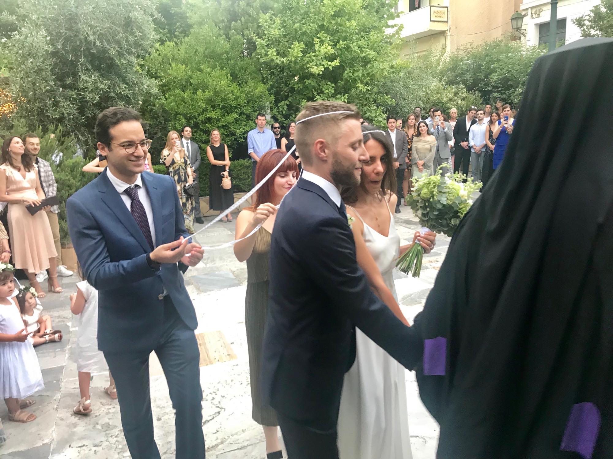 Το Μυστήριο τελέστηκε στον Βυζαντινό Ιερό Ναό της Αγίας Αικατερίνης (του 11ου αιώνα) στην Πλάκα, παρουσία συγγενών και φίλων και με παρανυφάκια τις κόρες του Μικέλη Χατζηγάκη, Ανίκα και Ελίζα.