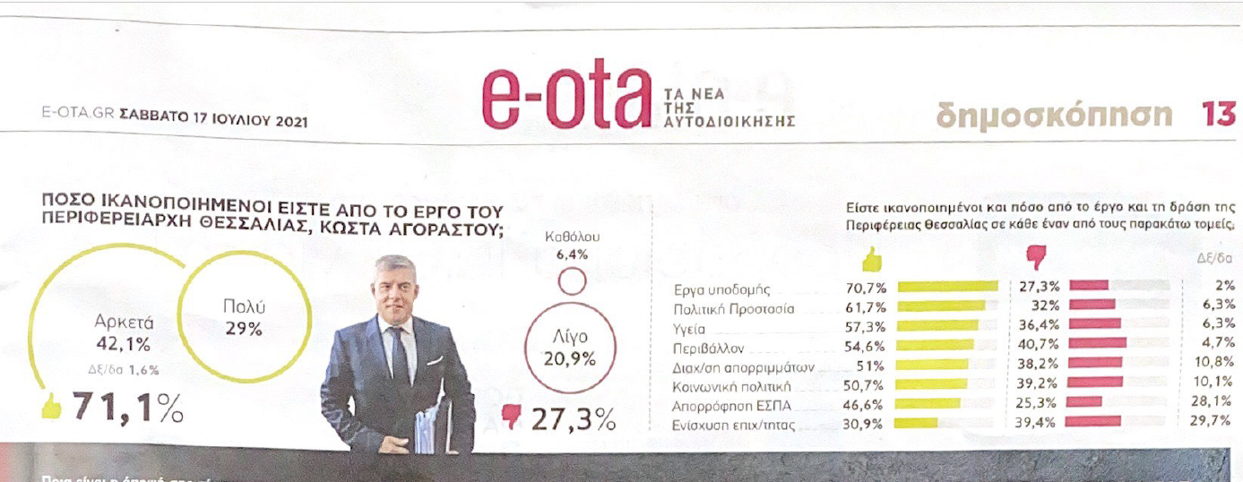 Συγκεκριμένα και όπως καταγράφει το trikalavoice.gr δημοσκόπηση της GPO για λογαριασμό της e-ota δίνει αποδοχή και ικανοποίηση για το έργο του Κώστα Αγοραστού στα… ιλιγγιώδη ποσοστά του 71,1% (42,1% αρκετά ικανοποιημένοι οι πολίτες και 29% πολύ).
