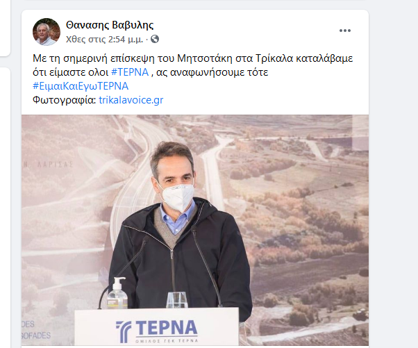 “Με τη σημερινή επίσκεψη του Μητσοτάκη στα Τρίκαλα καταλάβαμε ότι είμαστε ολοι #ΤΕΡΝΑ , ας αναφωνήσουμε τότε #ΕιμαιΚαιΕγωΤΕΡΝΑ”