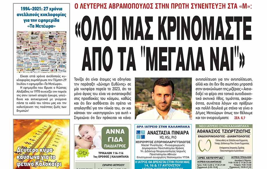 Με κύριο θέμα την πρώτη συνέντευξη του Λευτέρη Αβραμόπουλου μετά από την εκλογή του στη θέση του επικεφαλής της παράταξης «Δύναμη Ευθύνης» και τη θέση του υποψηφίου δημάρχου Δήμου Μετεώρων, κυκλοφορεί η εφημερίδα «Τα Μετέωρα».