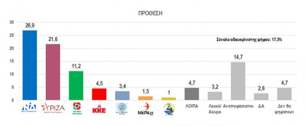 Εάν είχαμε εκλογές αύριο, σύμφωνα με τη δημοσκόπηση, η Νέα Δημοκρατία θα ήταν το πρώτο κόμμα με ποσοστό 26,9% και ο ΣΥΡΙΖΑ θα ακολουθούσε με 21,6%. Τρίτο κόμμα θα ήταν το ΠΑΣΟΚ – ΚΙΝΑΛ με 11,2% και τέταρτο το ΚΚΕ με 4,5%. Η Ελληνική Λύση θα βρισκόταν στο 3,4% και κάτω από το όριο του 3% το ΜεΡΑ25. Το άθροισμα «Αναποφάσιστων» και «Δεν απαντώ» φτάνουν το 17,3% των ερωτηθέντων.
