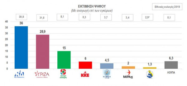 Στην εκτίμηση ψήφου τώρα, η εικόνα αλλάζει σημαντικά καθώς η Νέα Δημοκρατία φτάνει το 36% με τον ΣΥΡΙΖΑ να ακολουθεί στο 28,9% και τη μεταξύ τους διαφορά να διαμορφώνεται στις 7,1 ποσοστιαίες μονάδες. Η Νέα Δημοκρατία βρίσκεται στη συγκεκριμένη μέτρηση 3,9 ποσοστιαίες μονάδες χαμηλότερα από τις εκλογές του Ιουλίου του 2019 με τον ΣΥΡΙΖΑ 2,6 μονάδες χαμηλότερα από το ποσοστό που κατέγραψε στην ίδια κάλπη.