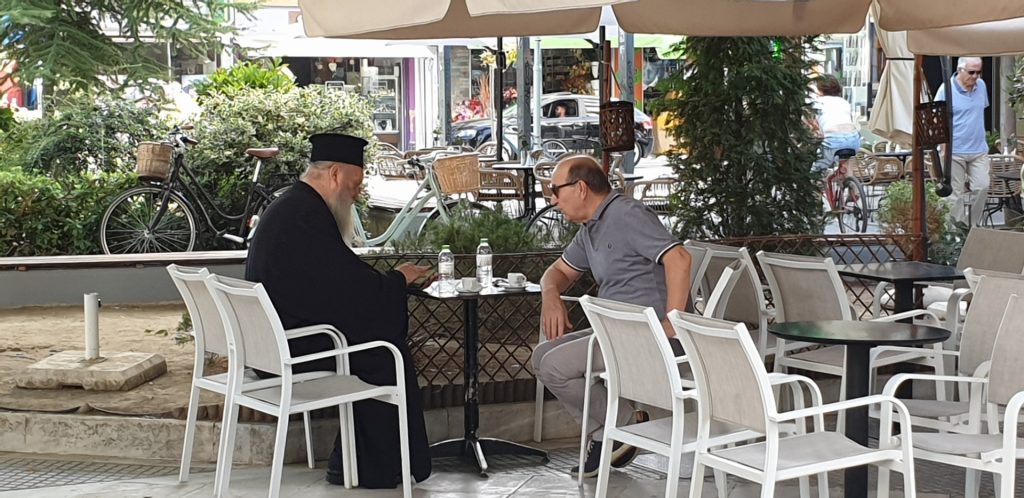 Αμφότεροι φημίζονται για το αγαθό των πράξεών τους και την ανιδιοτελή προσφορά τους στον συνάνθρωπο. Συνδέονται με κοινούς αγώνες για το καλό του σύμπαντος κόσμου, αγωνιούν δε για το αύριο της πατρίδος. Διακρίνονται μια από αυτές τις ζεστές μέρες του Αυγούστου ο αντιδήμαρχος και αναπληρωτής δήμαρχος Τρικκαίων Κώστας Ψύχος μετά του πνευματικού αδελφού αυτού, γέροντος Δημητρίου Κυρίτση, του αποκαλουμένου και αγίου Πράσινης Γωνιάς. Μελετάνε τας γραφάς, σχεδιάζουν το μέλλον…