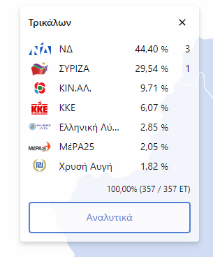 Ακολουθούν τα ποσοστά που είχαν λάβει τα κόμματα στα Τρίκαλα στις εκλογές της 7ης Ιουλίου 2019: