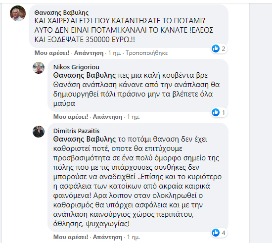 Ο Θανάσης Βαβύλης, ο οποίος μεγάλωσε επίσης στις όχθες του ποταμού, παρενέβη αφήνοντας σαφείς αιχμές για καταστροφή του Αγιαμονιώτη και μετατροπή του σε “κανάλι” και όντας περισσότερο αιχμηρός για το ποσό των 350.000 € που διατέθηκε γι’ αυτό το σκοπό από το Δήμο Τρικκαίων. Δείτε το διάλογο παρακάτω, στον οποίο παρεμβαίνουν και κοινοί τους φίλοι, της γενιάς τους: