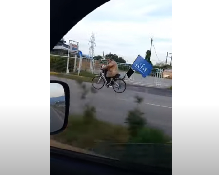 Κάπως έτσι εντοπίστηκε ποδηλάτης στην ε.ο Αθηνών-Λαμίας, στον παράπλευρο δρόμο στο ύψος της Λαμίας, να ποδηλατεί με μια γιγαντιαία σημαία πίσω… Ζήτω η Ελλάδα, ζήτω η θρησκεία, ζήτω η Νέα Δημοκρατία, δηλαδή!!!