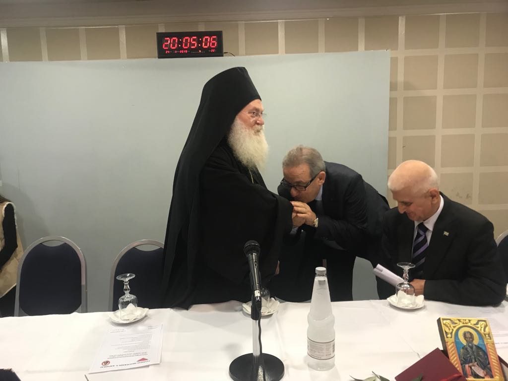 Ο πρόεδρος της ΕΑΣ Τρικάλων διακρίνεται με τον γέροντα Εφραίμ τον Βατοπεδινό κατά τη διάρκεια εκδήλωσης βράβευσής του από τον Σύλλογο Πολυτέκνων Καρδίτσας, όπου και τιμήθηκε για την εφαρμογή του προγράμματος του Εργοστασίου Γάλακτος ΤΡΙΚΚΗ «Κανένα παιδί χωρίς γάλα».