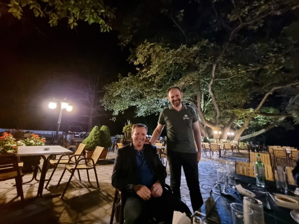 Διακρίνεται στη φωτό του trikalavoice.gr κάτω από τον… ιερό πλάτανο της Μύκανης με τον ιδιοκτήτη της περίφημης ταβέρνας, στο σταυροδρόμι των γεύσεων, Θέμη Μπέλο. Χαλαρά και… ήσυχα!…