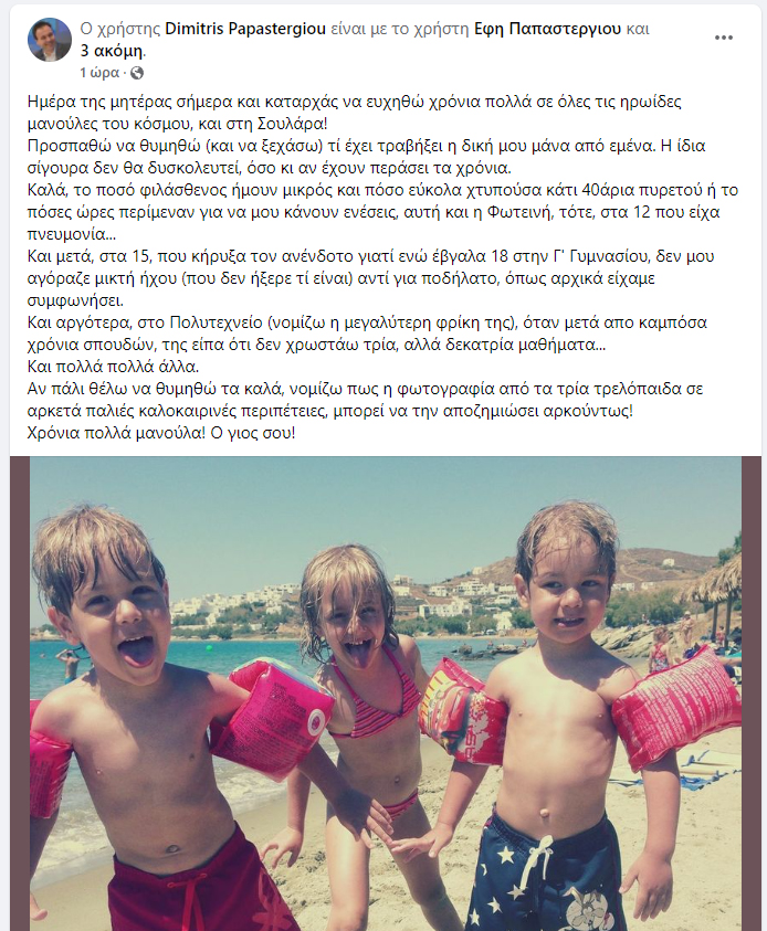 Ο… λυρικός Δημήτρης Παπαστεργίου μας συγκλονίζει για ακόμη μια φορά!… Τη φορά αυτή όχι με κανένα μεγάλο έργο (… από τα δεκάδες που βρίσκονται σε εξέλιξη στην πόλη και στα χωριά), αλλά με τον τρόπο που επιλέγει να ευχηθεί στην… καημένη τη μανούλα του, την κα Έφη, με αφορμή την “Ημέρα της Μητέρας”, αλλά και εμμέσως στην αιώνια αγαπημένη του Σούλα, “τη Σουλάρα” όπως χαριτωμένα την αναφέρει.