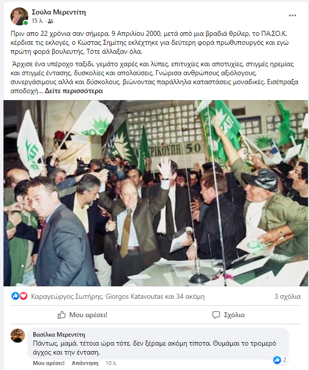 Ασφαλώς και τη μέρα αυτή τη θυμάται και την κρατάει μέσα της η Σούλα Μερεντίτη, που σάρωσε εκείνη τη βραδιά κερδίζοντας τη βουλευτική έδρα με την ψήφο και την αγάπη του κόσμου, εκπίπτοντας ωστόσο λίγους μήνες αργότερα από το Εκλογοδικείο. Επανήλθε φυσικά θριαμβευτικά το 2004. Η ίδια προχώρησε σήμερα σε μια συγκινητική ανάρτηση, ενώ σχολίασε σε πρώτο πρόσωπο η θυγατέρα της Βασίλκα Μερεντίτη. Δείτε παρακάτω: