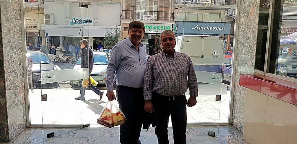 Περιχαρής εγένετο ο Χρήστος ο Σινάνης στο άκουσμα της είδησης ότι εγκρίθηκαν από τη Περιφέρεια σειρά έργων για την επαρχία του. Κι έτσι έφτασε φορτωμένος με ένα κουτί… μπακλαβαδάκια στη Νομαρχία για να γλυκάνει υπηρεσιακούς και πολιτικούς παράγοντες. Έγινε δε, δεκτός μετά δόξης και τιμής από τον άγρυπνο φρουρό του Μεγάρου, τον διαβόητο Θύμιο, με τον οποίο και διακρίνεται στη φωτό…